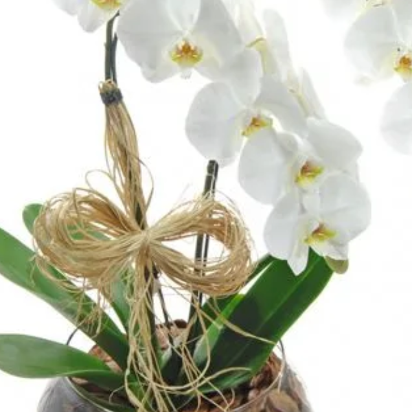 Uma opção elegante e sofisticada, esta orquídea Phalaenopsis branca apresenta duas hastes repletas de flores delicadas, simbolizando pureza e harmonia. A composição é acomodada em um vaso de vidro transparente, que destaca ainda mais a beleza natural da planta e traz um toque de modernidade ao ambiente.