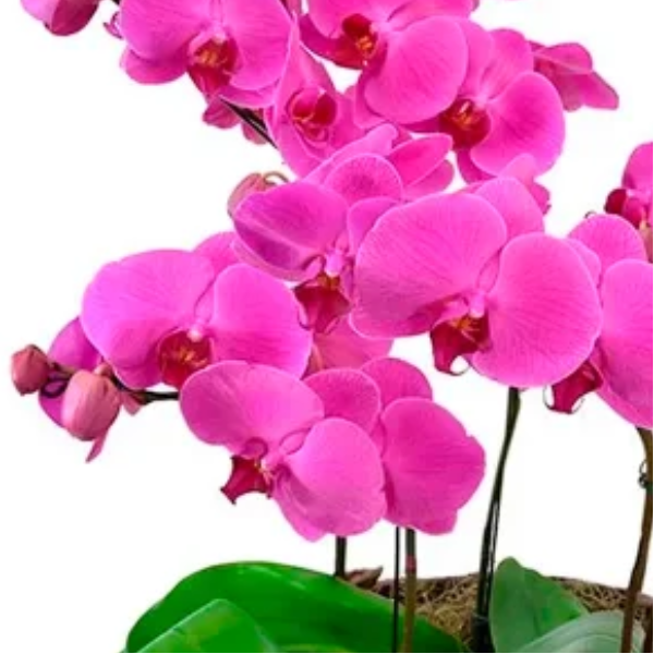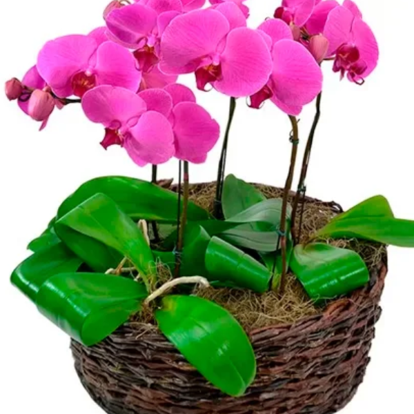 Cinco deslumbrantes Orquídeas Phalaenopsis Pink acomodadas em uma sofisticada cesta de vime.